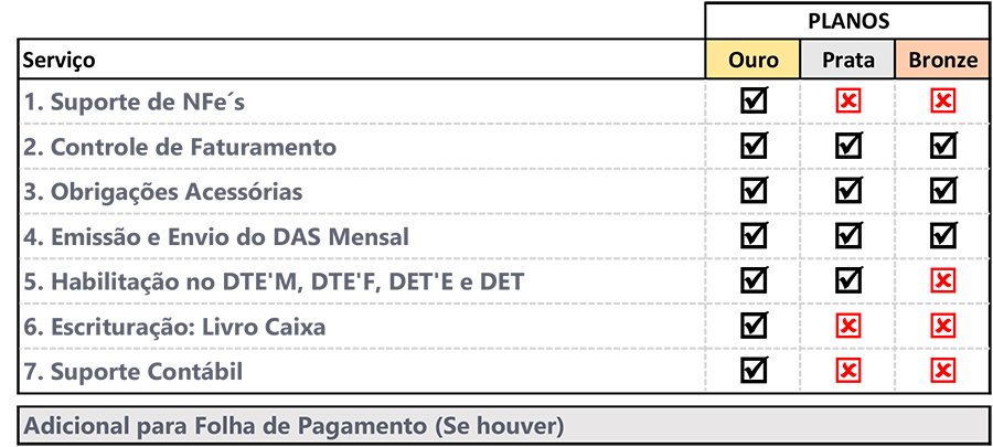 - Apoio ao Crescimento: Nossos planos atendem desde o MEI iniciante até aquele que já possui maior volume de faturamento.